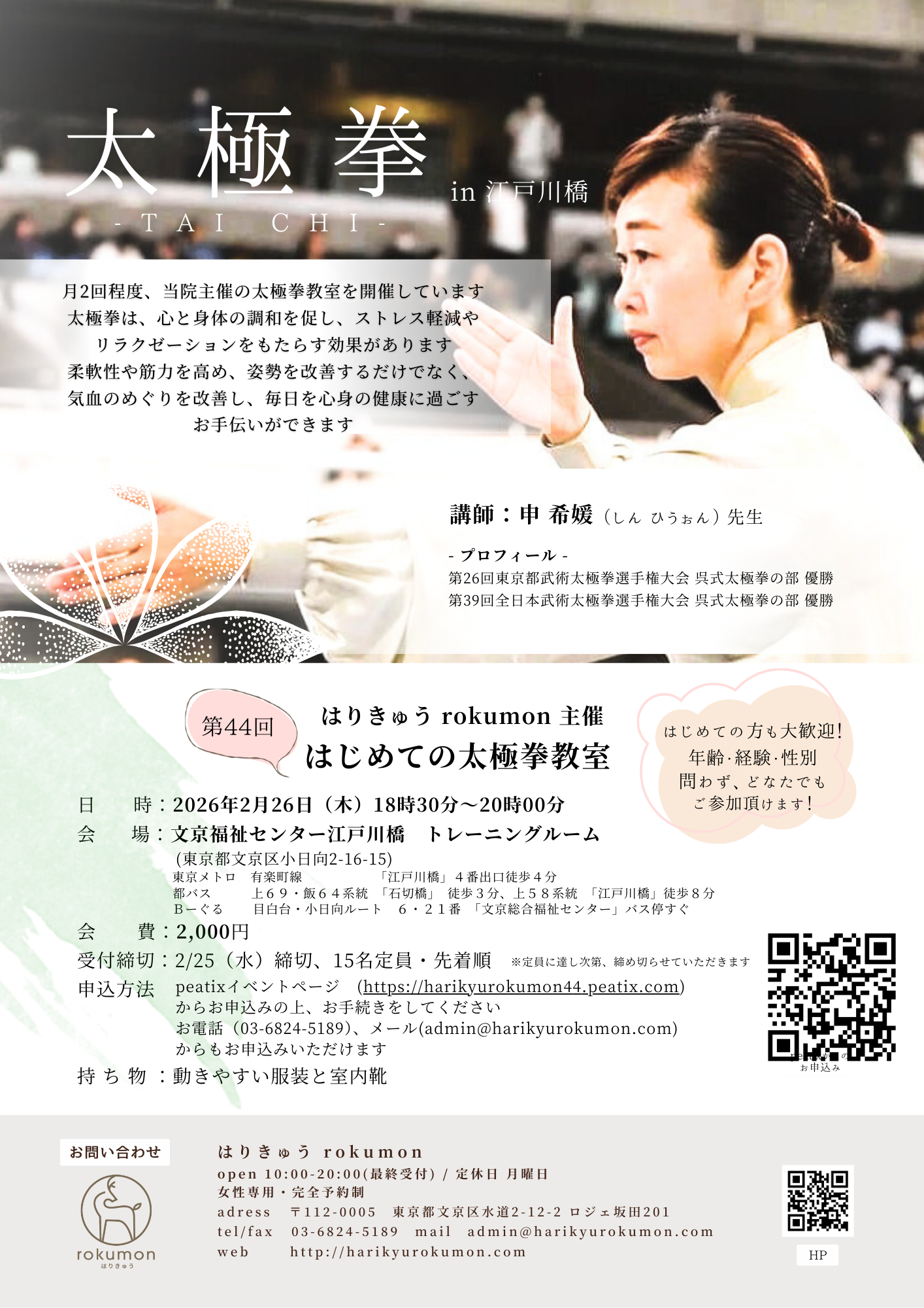 第44回目となる当院主催の太極拳教室を、2月26日(木)に開催する運びになりましたので、ご案内申し上げます!